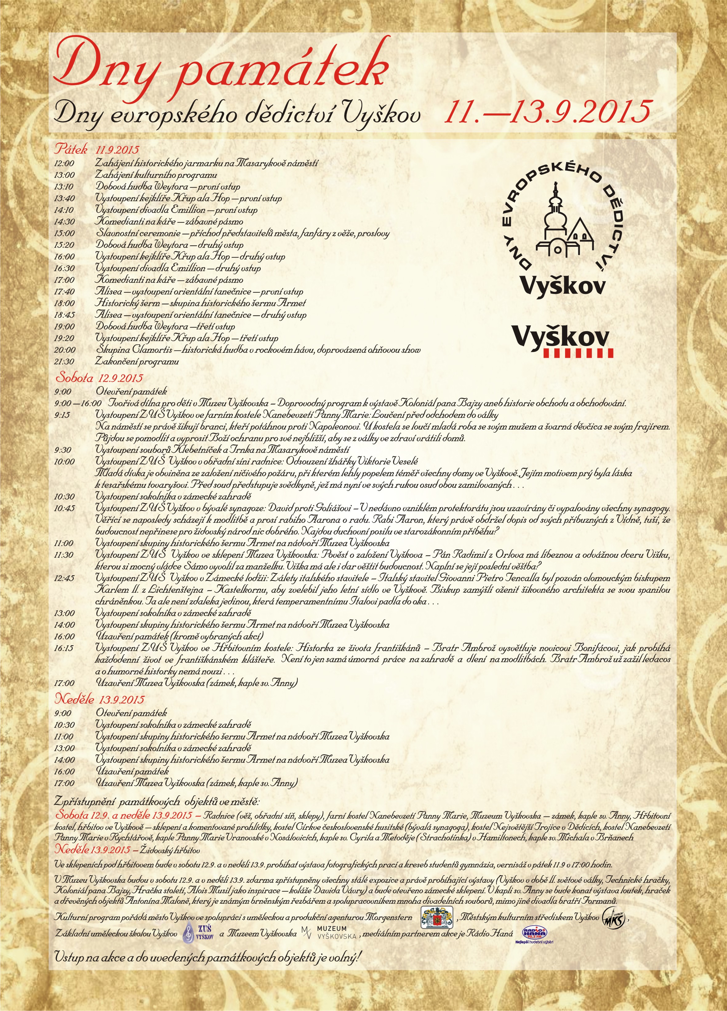 „Kromě návštěvy zpřístupněných památek bychom veřejnost rádi pozvali právě na páteční zahajovací odpoledne. Opravdovou třešničkou na dortu a zároveň úplnou novinkou pro Vyškovany bude potom večerní koncert středověké rockové skupiny Clamortis s ohňovými prvky,“ uzavřela pozvání na víkend ve Vyškově Bezdomniková.